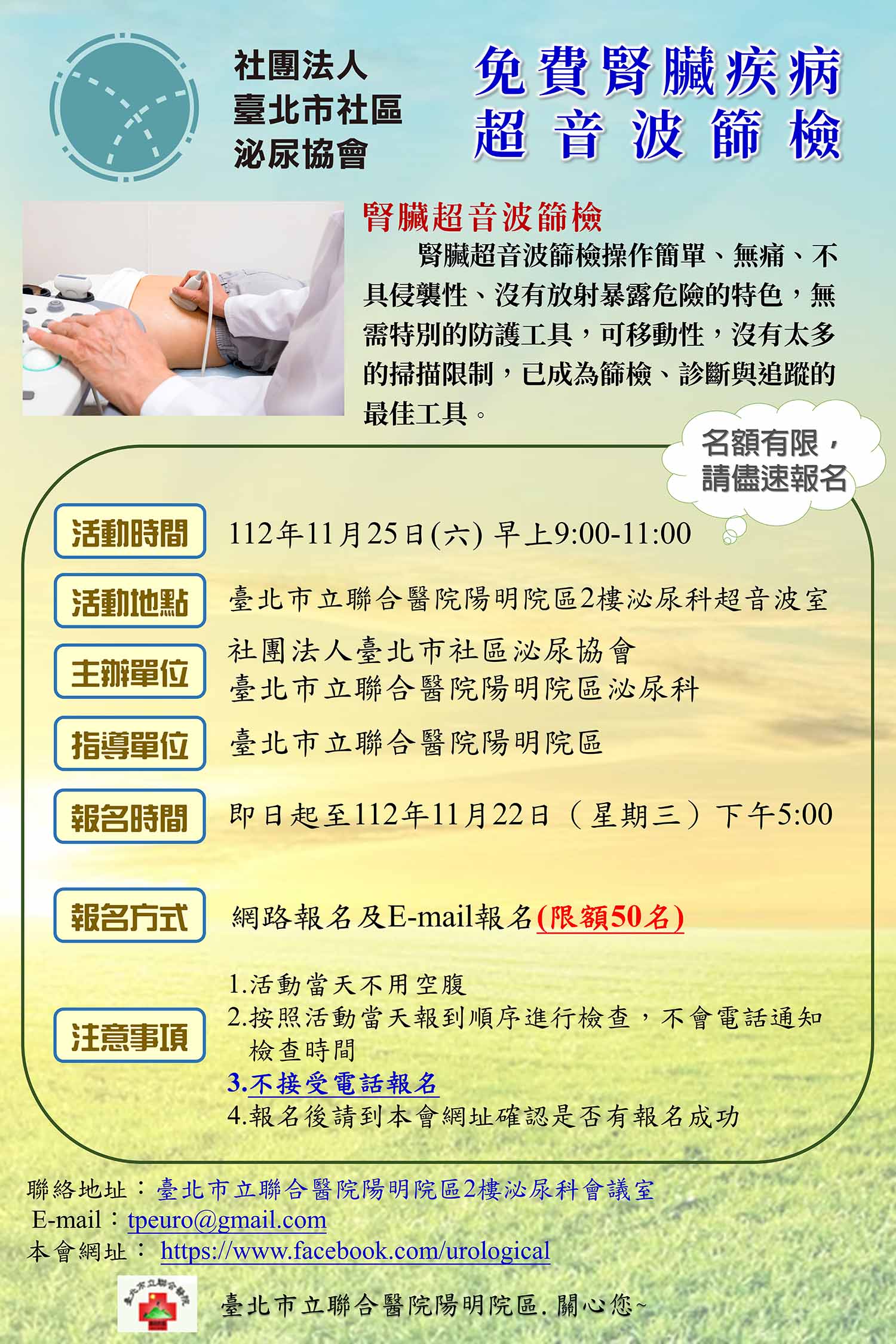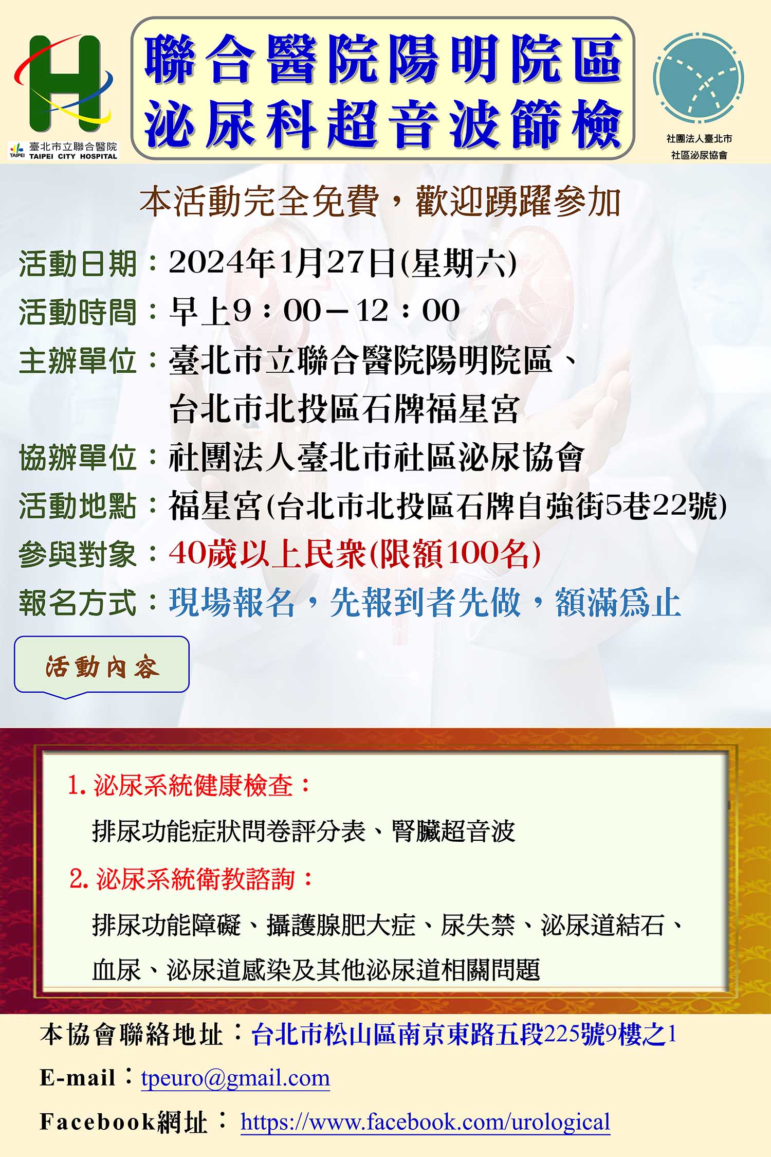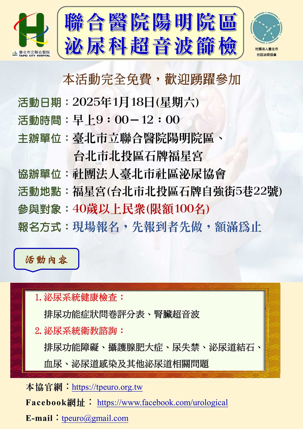 協會公告 2026-2-7 腎臟疾病超音波篩檢活動— 地點 : 台北市北投區福星宮 2025-9-13社區民眾腎臟疾病超音波篩檢活動地點 : 臺北市立聯合醫院陽明院區 2025-1-18 腎臟疾病超音波篩檢活動地點 : 台北市北投區福星宮 2025-1-7「攝護腺癌的認識、治療方式與花費」地點:財團法人保險事業發展中心 2024-9-21 社區民眾腎臟疾病超音波篩檢活動地點:臺北市立聯合醫院陽明院區 2024-8-29「預防尿路感染」衛教活動地點:台北市士林區陽明老人公寓 2024-4-27 「漫談前列腺疾病」衛教活動地點:台北市信義區仁愛路四段正和區民活動中心 2024-1-27 腎臟疾病超音波篩檢活動地點:台北市北投區福星宮 2023-12-14「漫談前列腺疾病」衛教活動地點:台北市信義區崇德街里民活動場所 2023-11-25 社區民眾腎臟疾病超音波篩檢活動地點:臺北市立聯合醫院陽明院區 2023-8-7「醫療特色衛教講座」地點:臺北市立聯合醫院陽明院區一樓大廳